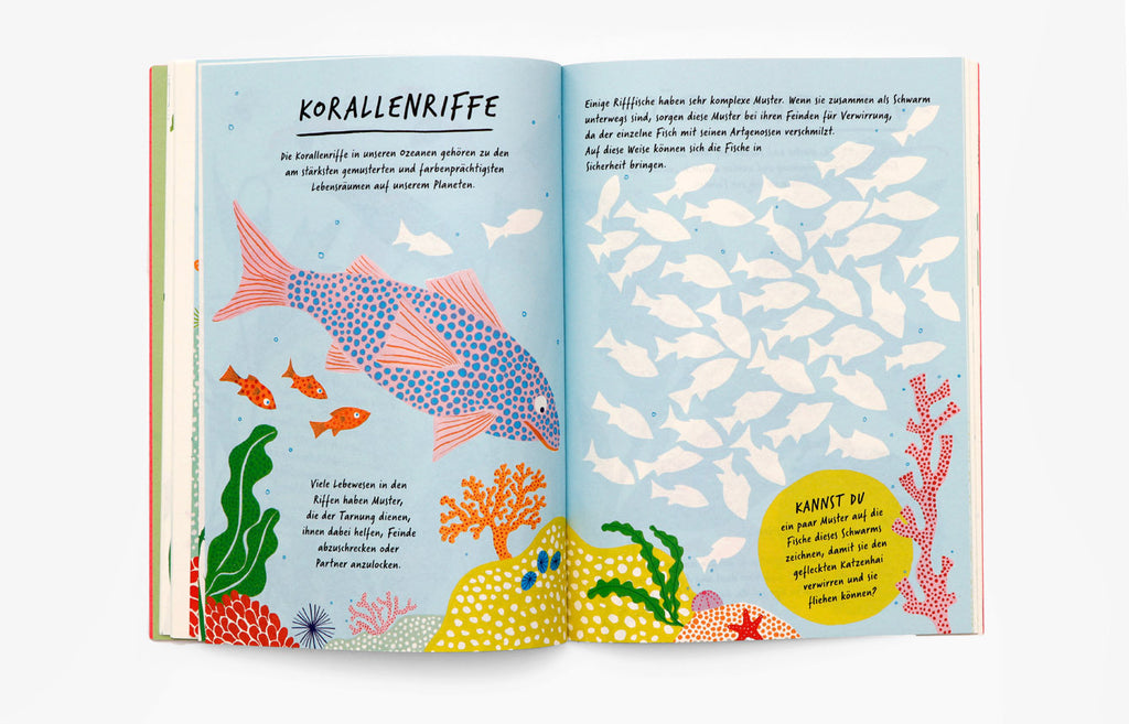 Jede Seite gibt zusätzlich Informationen darüber, warum die jeweiligen Muster in der Natur vorkommen - sei es zur Tarnung, um eine Partnerin anzulocken oder um sich zu verteidigen. Von faszinierenden Baumringen bis hin zu glitzernden Fischschuppen - dieses Buch ist voll von Pflanzen und Tieren, die nur darauf warten, mit hübschen Details versehen zu werden!