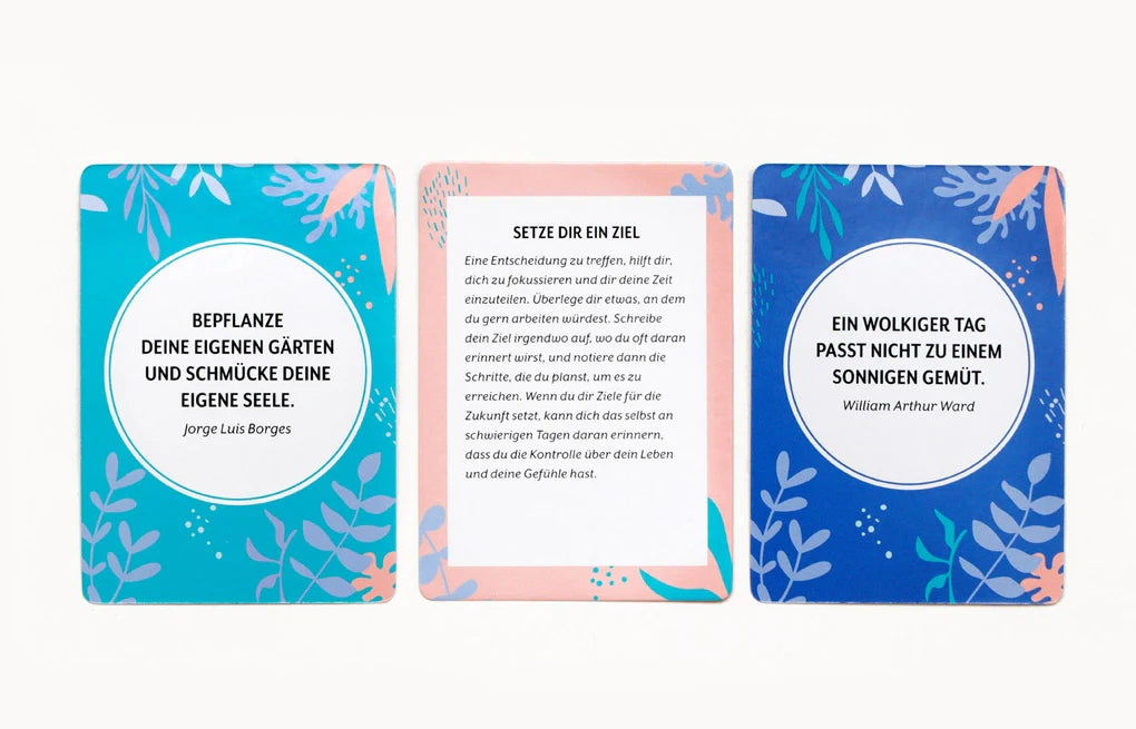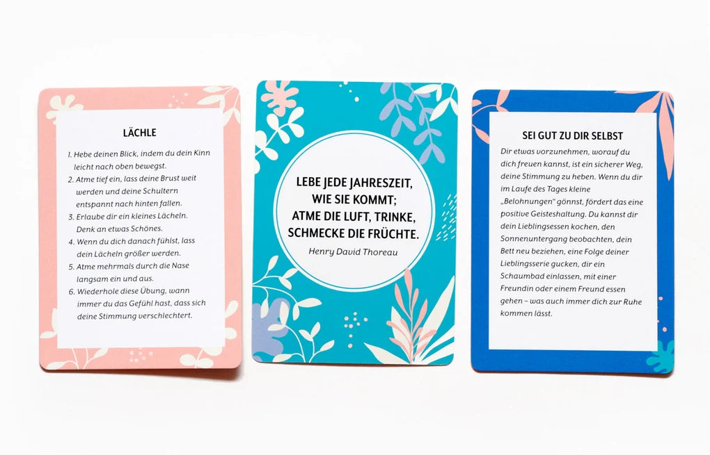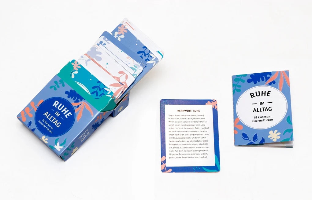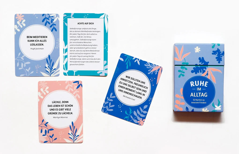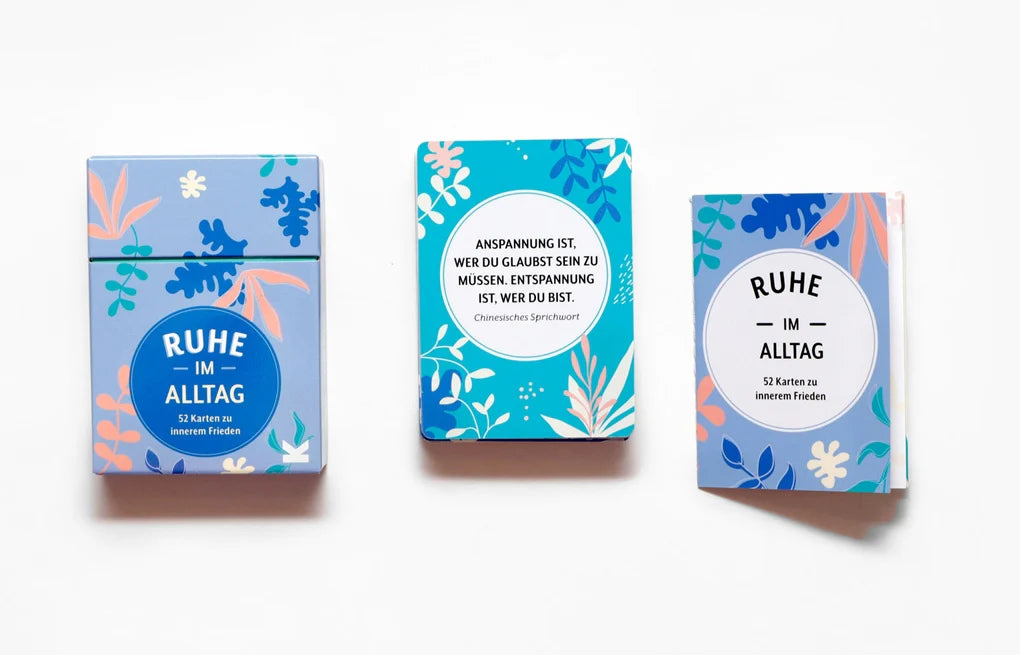 Willkommen zu eurer täglichen Dosis Ruhe! Die Tipps, Übungen und Zitate bekannter Persönlichkeiten auf diesen 52 Karten werden euch helfen, im Alltag Stress abzubauen, den Geist zu beruhigen und inneren Frieden zu finden.