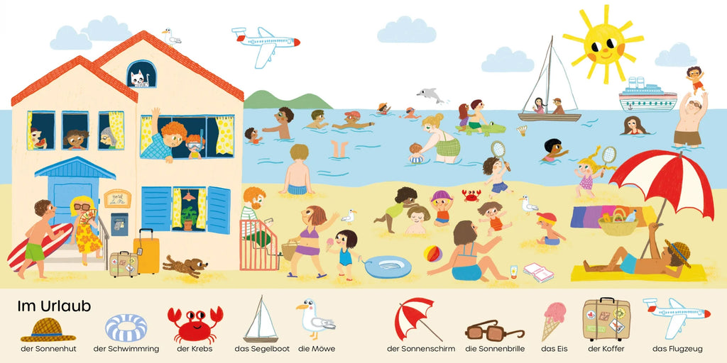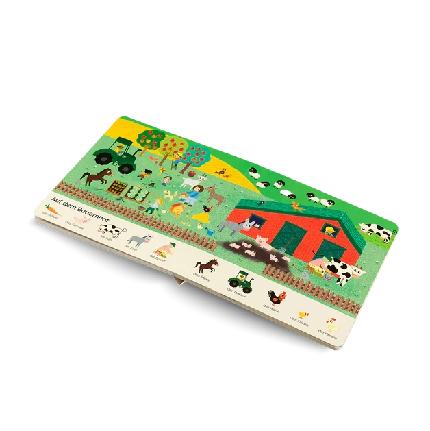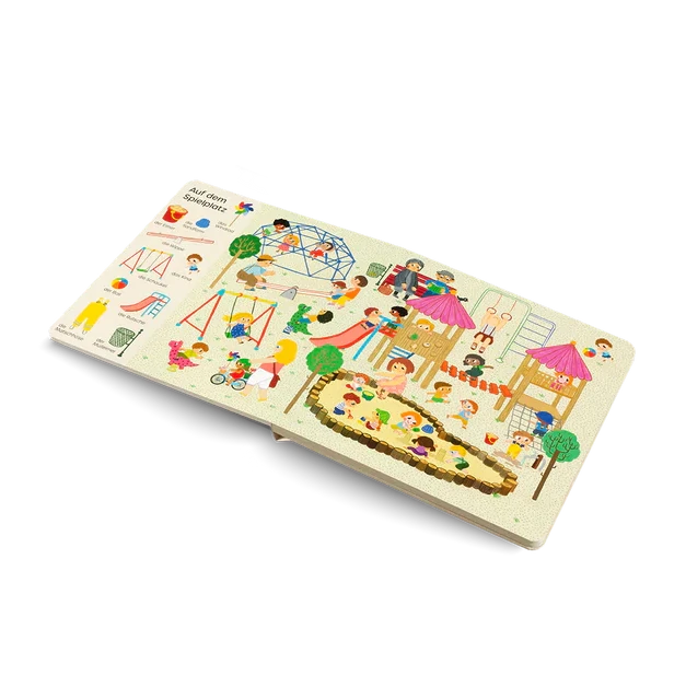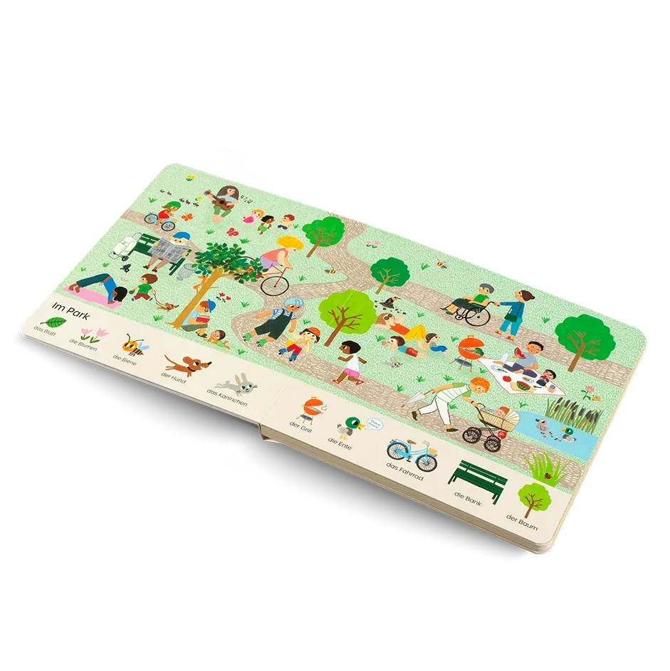 Was steht dort auf dem Esstisch und was ziehe ich heute an? Wem begegne ich auf dem Spielplatz und welche Tiere kenne ich schon im Tierpark? Zuhause, in der Kita oder draußen auf der Straße – überall gibt es so viel zu entdecken. In diesem Buch erkennen Kinder die Gegenstände aus ihrer täglichen Lebenswelt wieder und lernen spielerisch ihre Namen kennen. Farbenfroh illustrierte Szenen im Supermarkt, beim Kinderarzt, im Park oder im Kinderzimmer laden zum Ausdenken eigener Geschichten ein.