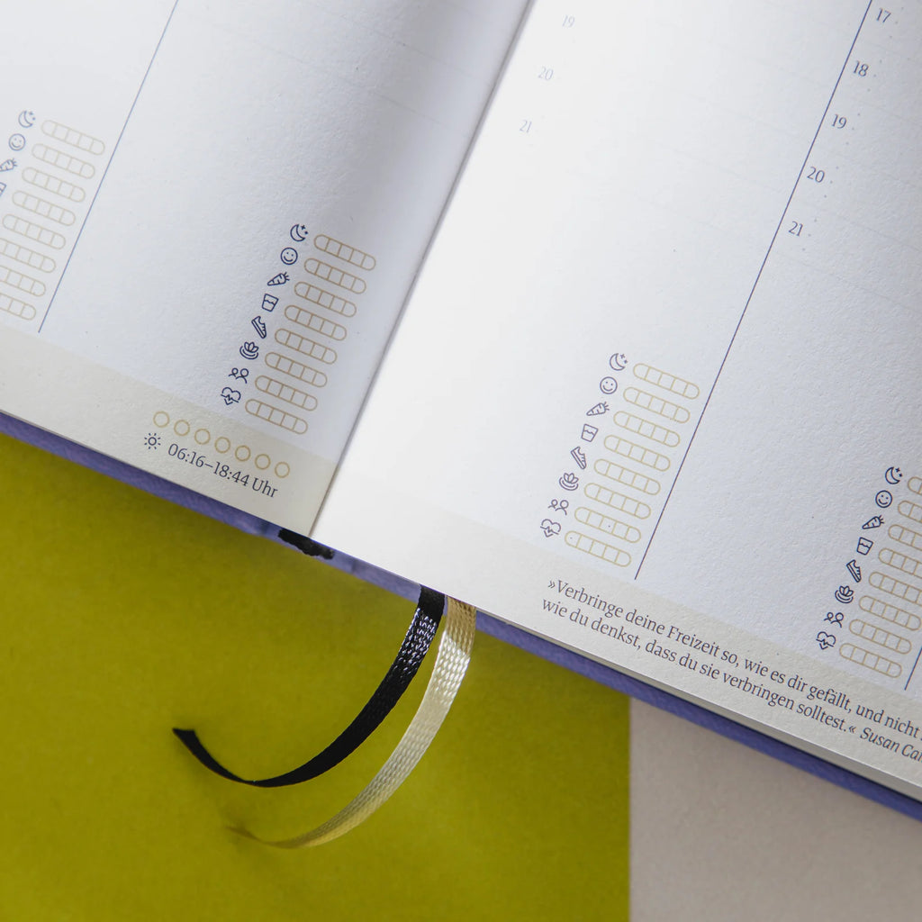 Lass die Wochen nicht einfach strukturlos über dich hereinbrechen, sondern verschaffe dir mit der Wochenansicht von Ein guter Plan Pro Klarheit. Organisere deinen Tag und reflektiere Faktoren wie Schlaf, Laune und Stress in der von uns entwickelten Achtsamkeitsampel. So erkennst du Zusammenhänge schnell und legst den Fokus bewusst auf dich und dein Wohlbefinden.