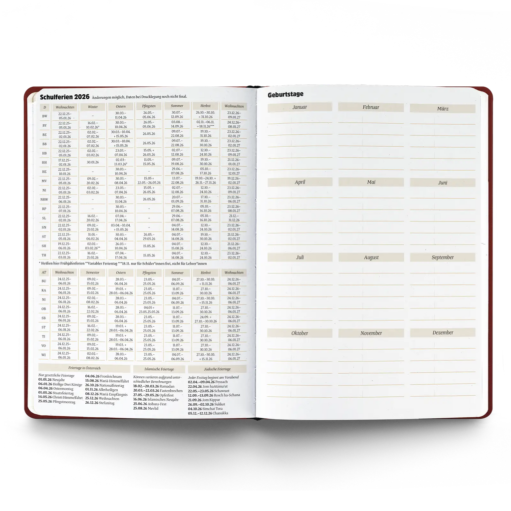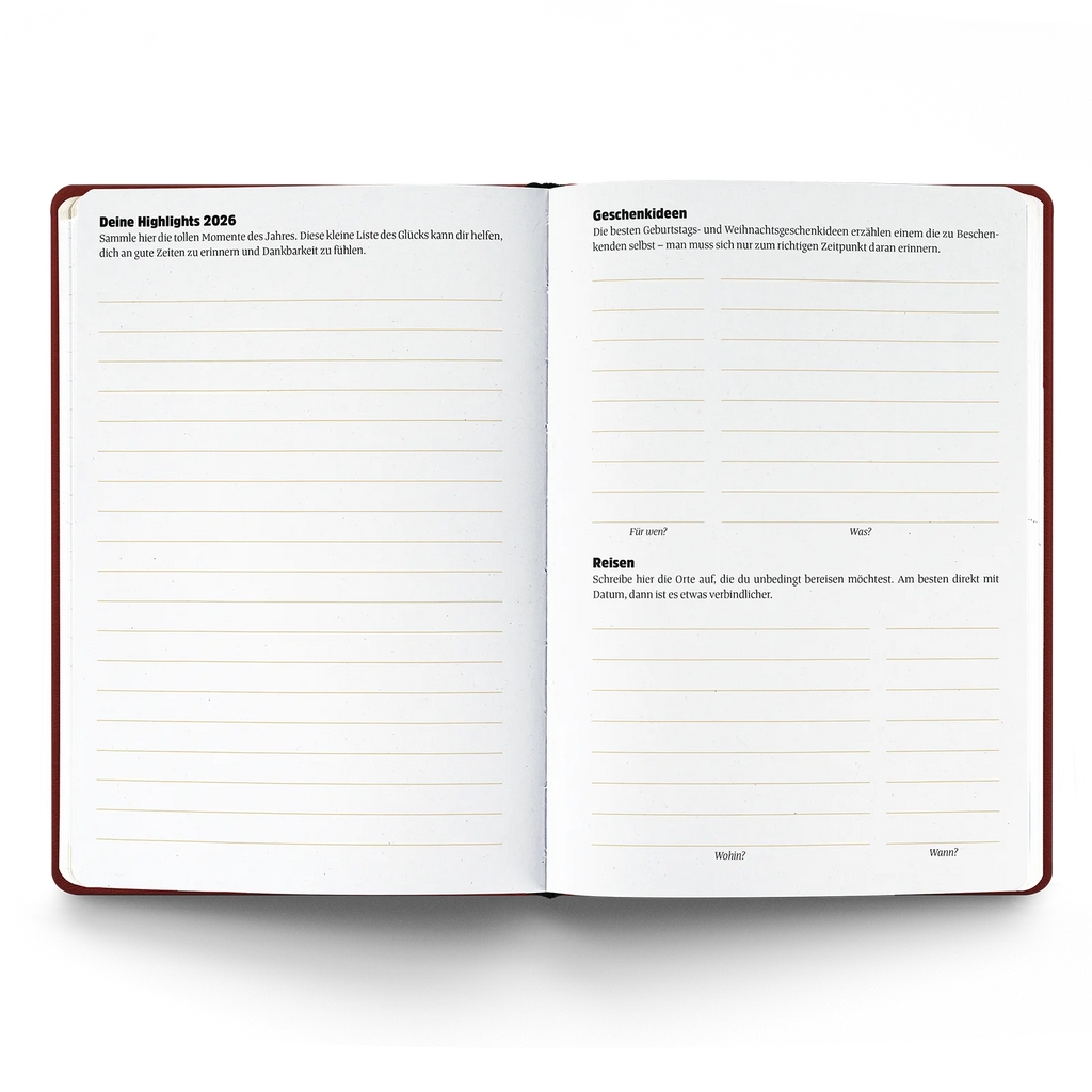 Ein guter Plan Pro 2026 ist ein ganzheitlicher Terminkalender, der dir viel Platz für deine Aufgaben, Notizen und Ziele bietet. Die Pro-Version ist robuster und etwas kompakter als Ein guter Plan und bietet trotzdem mehr Platz für Termine und Aufgaben. Weltneuheit: Das Kunstleder besteht hauptsächlich aus Pflanzenfasern statt Erdöl.