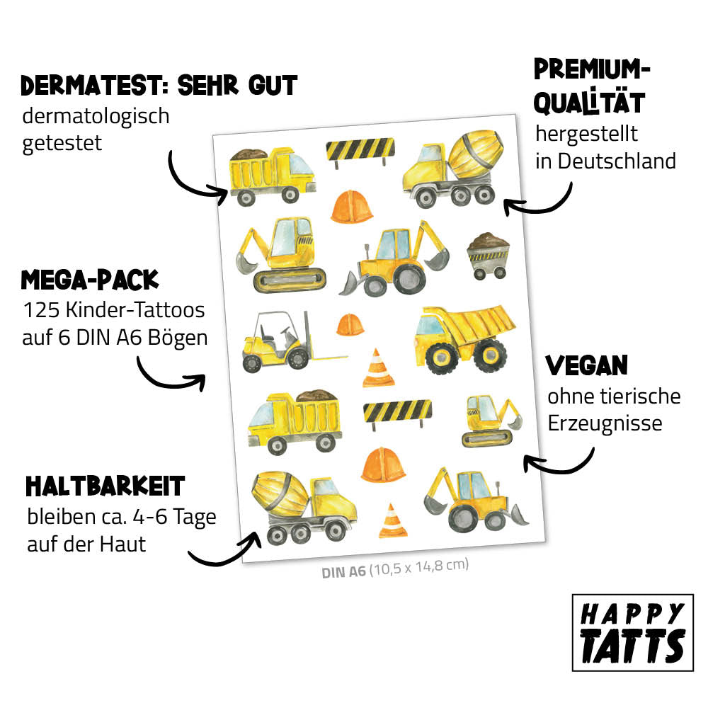 Happy Tatts Tattoos sind speziell für empfindliche Kinderhaut entwickelt, absolut hautfreundlich, dermatologisch getestet und haben eine hervorragende Haltbarkeit von 4–6 Tagen. Dank der hochwertigen Materialien lassen sie sich leicht auftragen & rückstandslos entfernen.