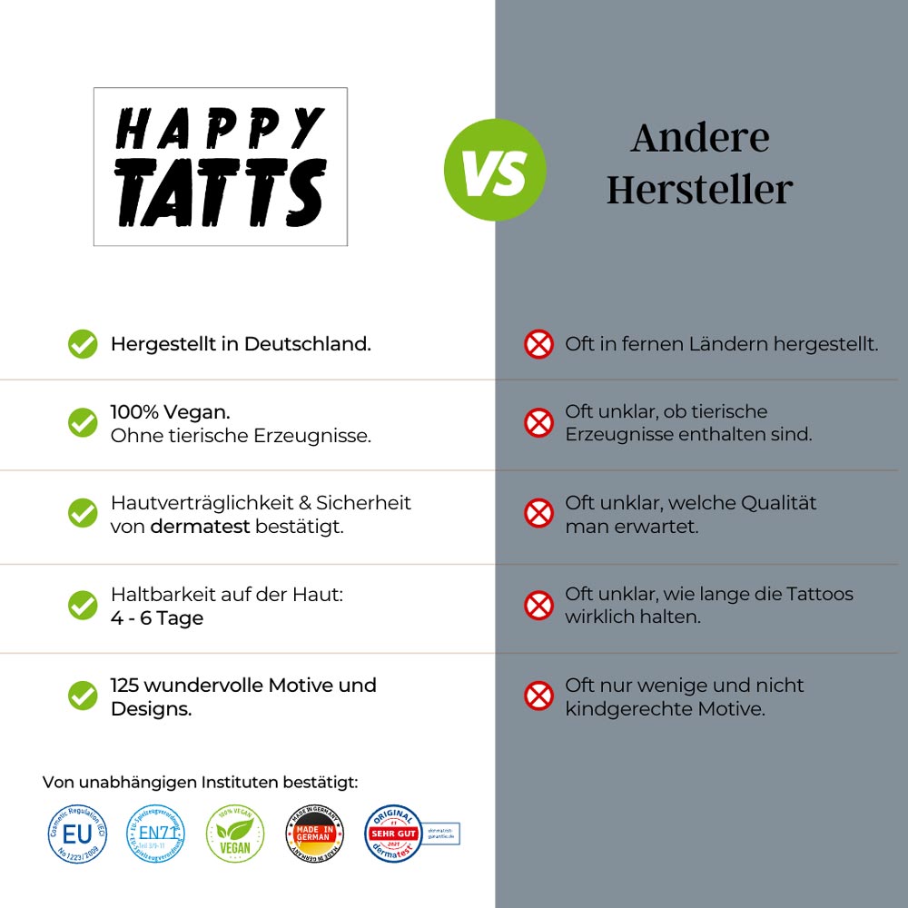 - Hergestellt in Deutschland: HAPPY TATTS werden in Deutschland und unter strengsten Qualitätsrichtlinien hergestellt.