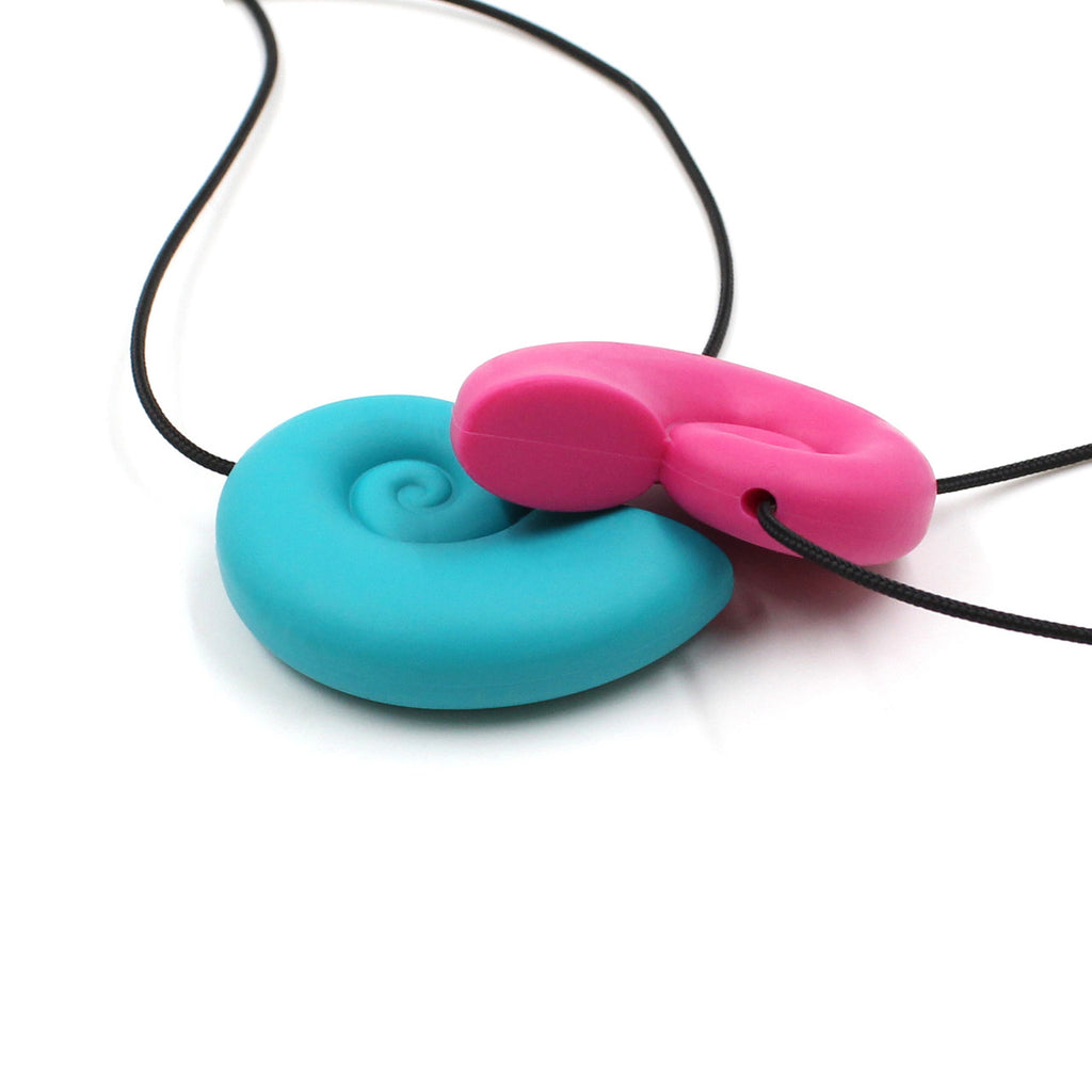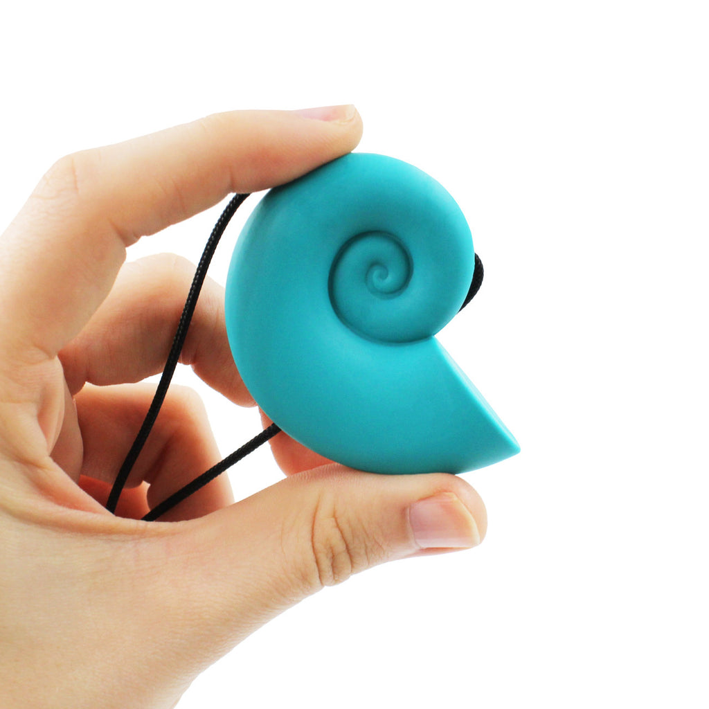ARK's Seashell Chew Necklace - a robust chewelry option for anyone who needs to chew. Fans of the beach, mermaids, the ocean, and more will love this nautilus-themed design. Because of the spiral shape, this seashell chew pendant gets thicker as it spirals out, giving you the option to chew on different thicknesses.
