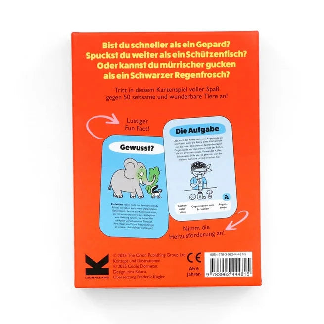 Schließt euch mit euren Freund*innen oder Kindern zusammen, um im Wettkampf mit den Tieren den Sieg davonzutragen! Erfahrt dabei faszinierende Fakten über Affen, Flamingos & Co., während ihr euch 50 tierischen Herausforderungen stellt. Das Kartenspiel ist für jede Gruppengröße geeignet und ist auch für Kinder leicht verständlich.