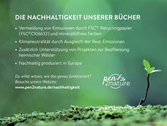 Alle Bücher und Blöcke wurden mit Farben auf Pflanzenöl-Basis und auf 100 % Recyclingpapier gedruckt. Der Verlag pen2nature unterstützt Klimaschutzprojekte und spendet 10 Cent pro Produkt für die Pflanzung neuer Bäume in heimischen Wäldern.