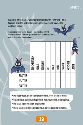 Wo übernachten die Fledermäuse Flatter, Flitter und Flotter? Welcher Würfel entspricht dem Faltplan? Und was ist die Summe aus 160 und 172? Diese und viele weitere Denkaufgaben der fröhlich-bunten Mischung aus der Feder des bekannten Rätselmachers Stefan Heine sorgen für ordentlich Schwung im Oberstübchen und lassen garantiert keine Langeweile aufkommen. Zum Abgleich findet sich die Lösung jedes Rätsels auf dessen Rückseite.