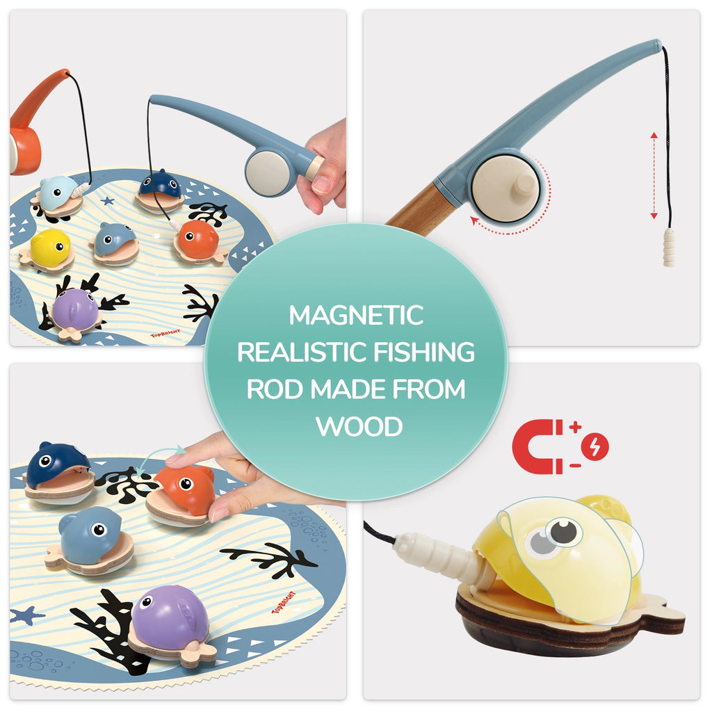 Mit funktionellen Angelruten aus Holz mit realistischen Rollen können Kinder so viele Fische wie möglich fangen. Das Set enthält sechs dreidimensionale Magnetfische in einem einzigartigen Design, das die Fantasie eines Kindes anregt. Die weiche Stoffmatte dient als Basis für ein komfortables und angenehmes Spielerlebnis.