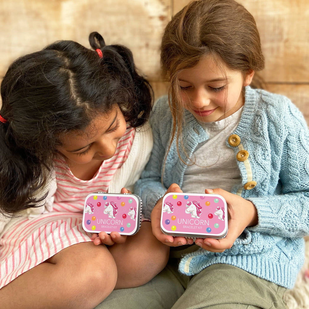 Eine wunderschöne Geschenkdose mit Gummiband und Perlen zur Herstellung eines Einhorn-Armbands. Das Gummiband ist mit Metallenden ausgestattet, um kleinen Kindern das Perlensticken zu erleichtern.