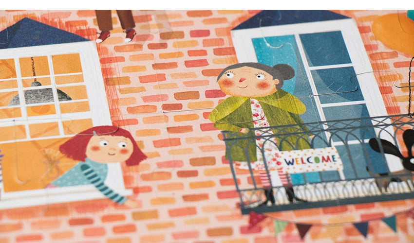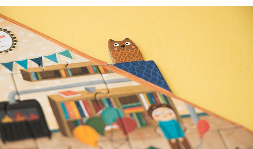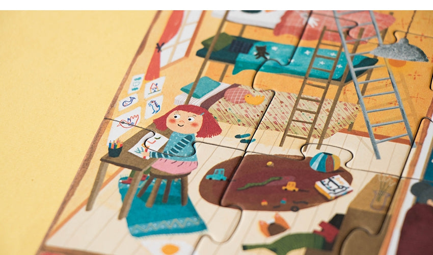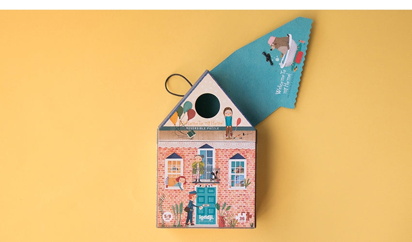 Das süße doppelseitige Puzzle von Londji zeigt ein lebhaft bewohntes Zuhause auf zwei Seiten: einmal die Hausfassade von außen und einmal die vielen Räume im Inneren des Hauses. Wir bekommen einen Einblick in die liebevoll eingerichteten Zimmer des Heims und könne jede Ecke mit ihren Details und die freundlichen Bewohner kennenlernen.