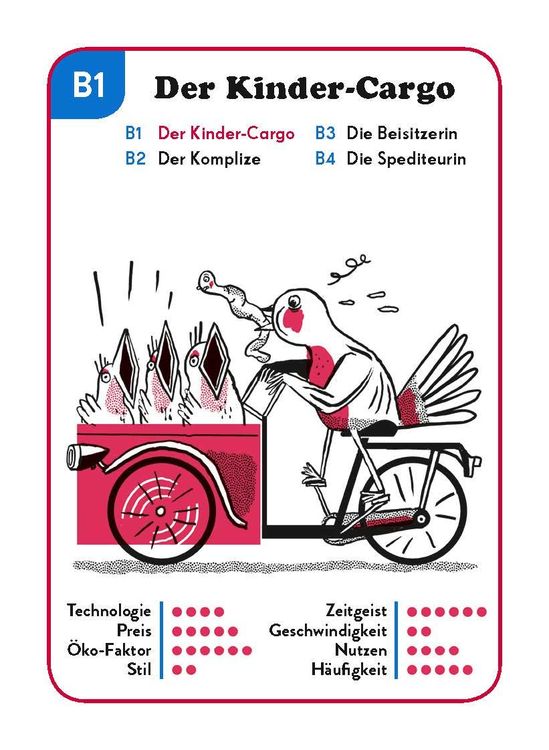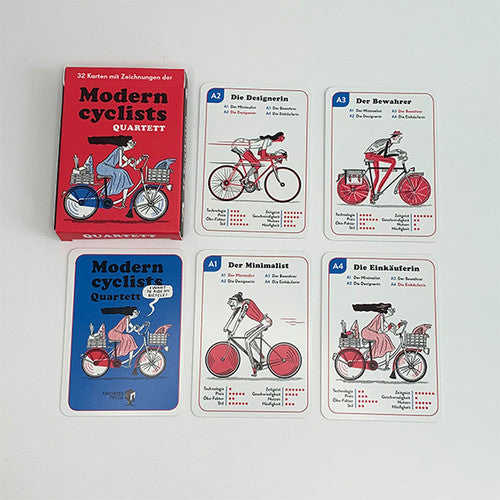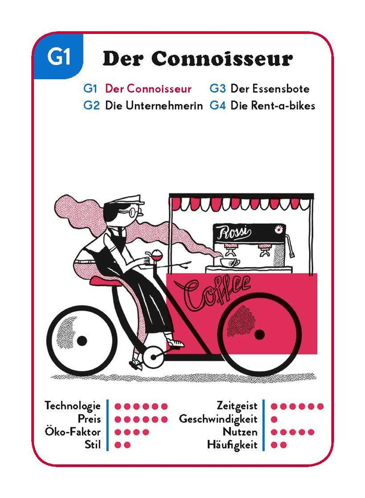 »Die Vielfalt der Fahrradkultur« bildet Jakob Hinrichs mit seinen Modern Cyclists ab. Und da jede*r Radler*in sehr individuell unterwegs ist, gibt es auch Haltungsnoten. Kategorien wie Öko-Faktor, Stil und Zeitgeist ergeben einen großen Spielespaß. Selbstverständlich ist es auch normales Quartett zu spielen.