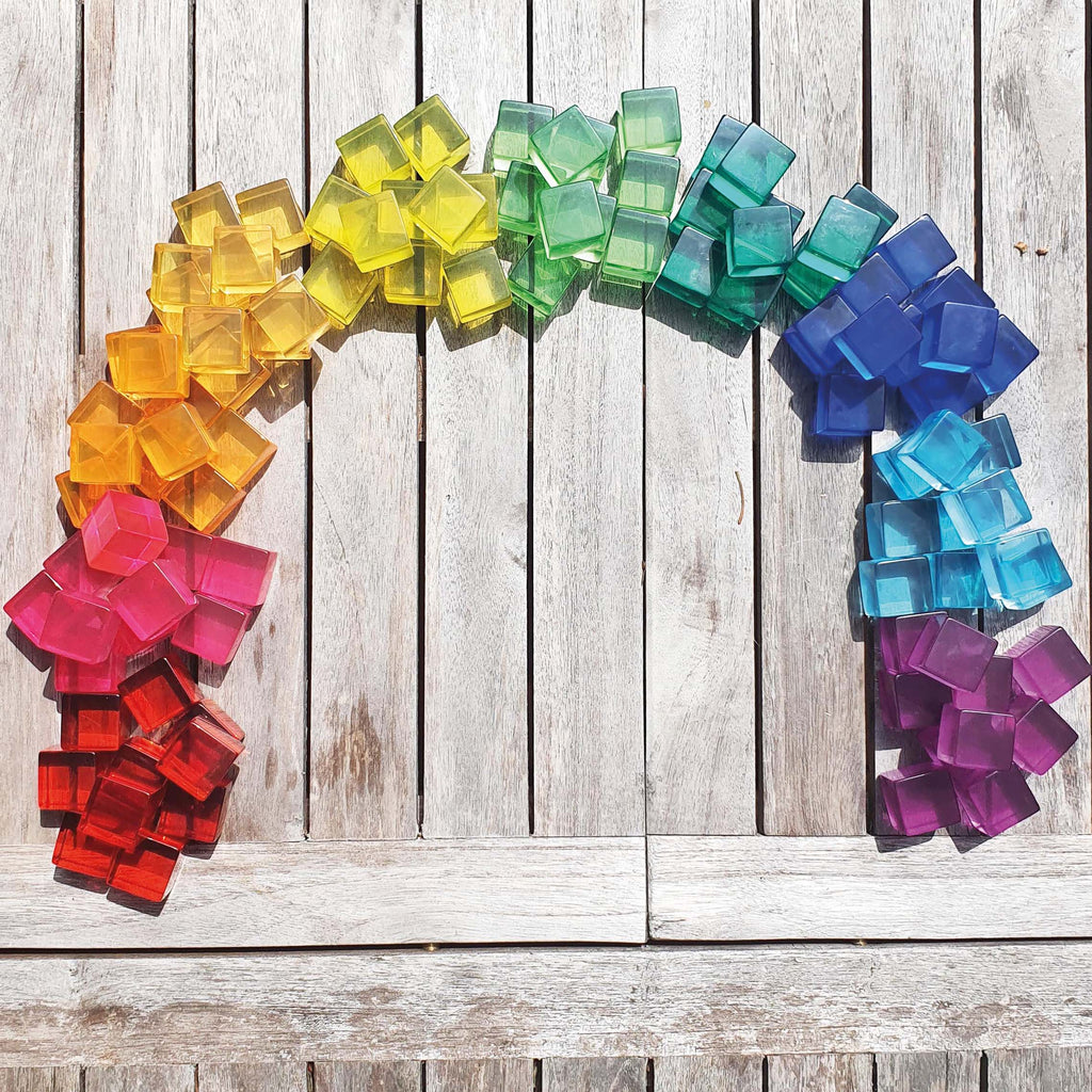 Die durchsichtig schimmernden Acrylwürfel sind toll als eigenständiges Spielzeug zum Bauen, Konstruieren, Experimentieren und Staunen oder als perfekte Ergänzung zu verschiedenen Holzbausteinen, Leuchttischen und im Farbenkreis.