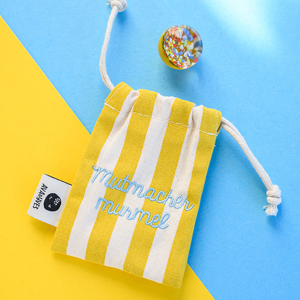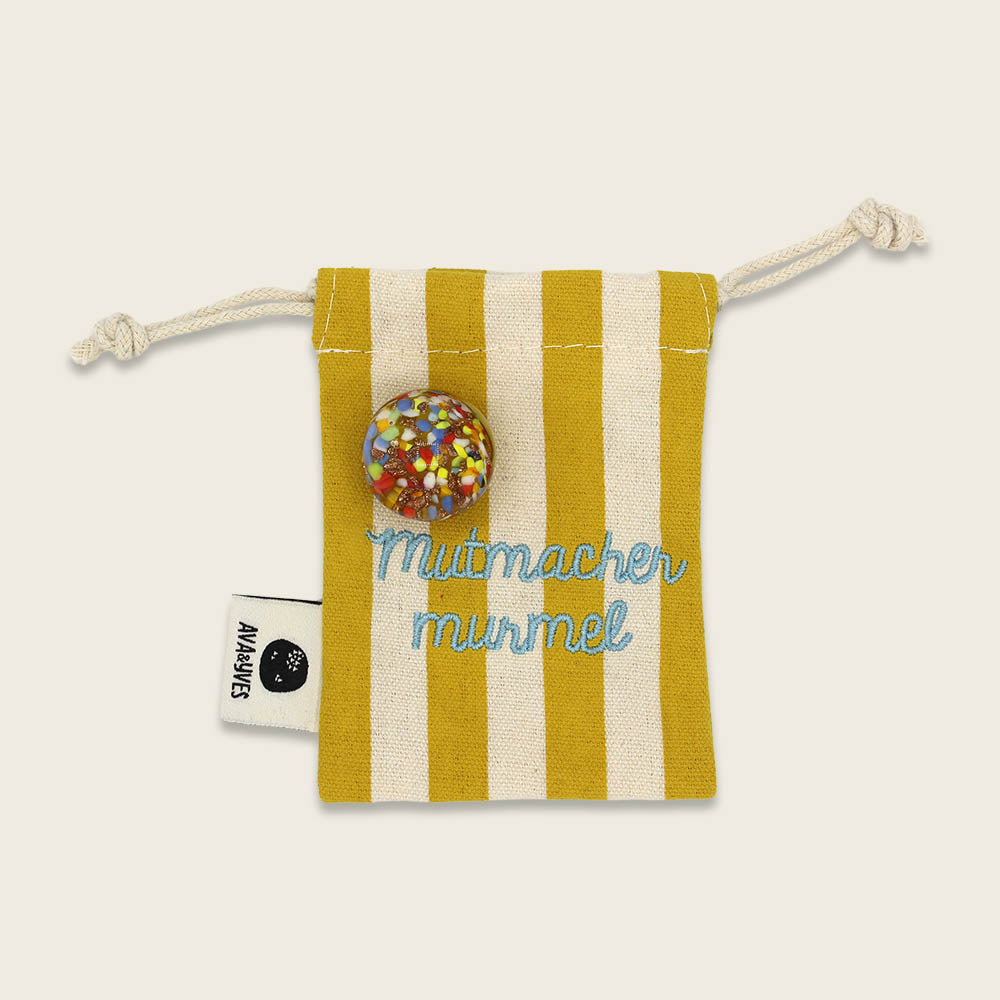 Eine hinreißend schöne Mutmacher-Murmel aus Muranoglas in hochwertigem, gestreiften Stoffbeutel mit süßer Stickerei "Mutmachermurmel".