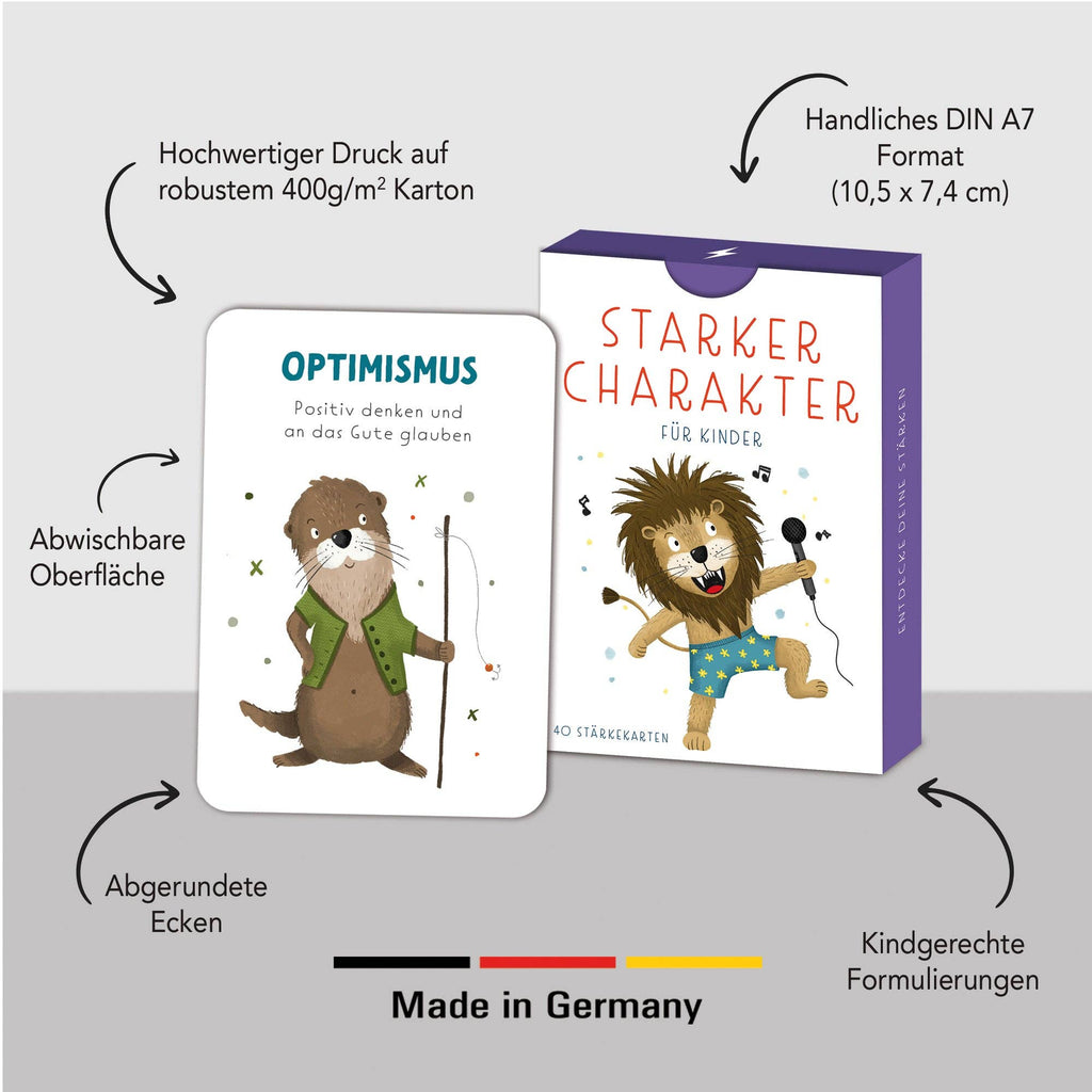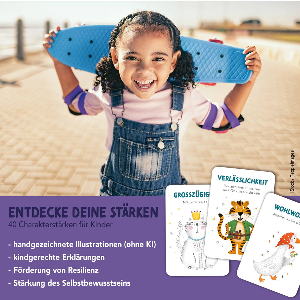 Hilf Kindern, ihr volles Potenzial zu entfalten! Die Stärkekarten sind perfekt, um spielerisch Selbstvertrauen und Resilienz aufzubauen. Jede der 40 liebevoll handgezeichneten Karten zeigt eine besondere Charakterstärke – von Mut und Geduld bis hin zu Kreativität und Mitgefühl. Auf der Rückseite findest du jeweils leicht verständliche Erklärungen.