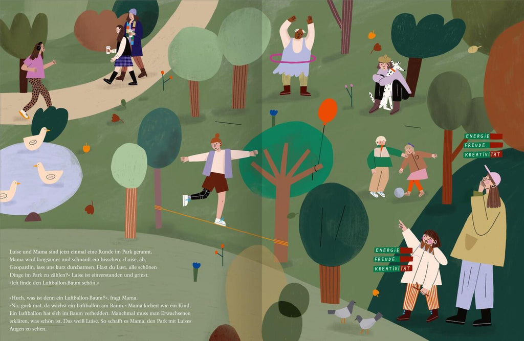 Luise hat einen langen Kindergartentag hinter sich und fühlt sich völlig leer. Alles nervt, nichts macht Spaß. Ihre Spielsachen sind langweilig, Mama ist gestresst - und plötzlich kracht es. Da merkt Mama, dass sie selbst dringend eine Pause braucht, genau wie Luise. Gemeinsam gehen sie in den Park, wo frische Luft, bunte Blätter und die Vorstellung, so schnell wie ein Geopard zu rennen, Luises Laune aufhellen. Beim Rennen, Toben und Entdecken laden beide ihre Batterien wieder auf. Aus der Wut wird Freude, aus Langeweile wird Kreativität. Am Ende basteln Luise und ihre Mama eine Schatzkarte mit all den schönen Dingen, die sie entdeckt haben - und erkennen, dass Pausen wahre Schätze sind.