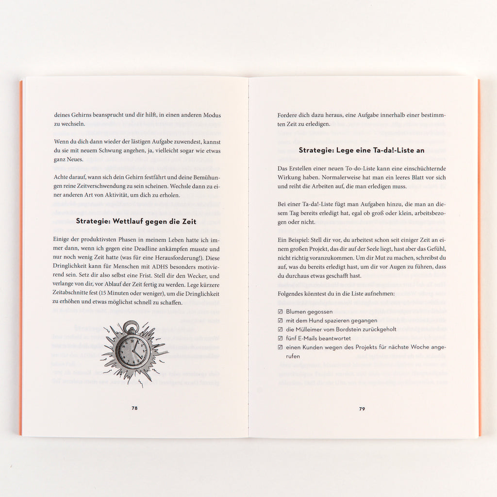 »Wie kann ich mit ADHS im Alltag produktiv, verlässlich und zielorientiert handeln?« Das ADHS-Gehirn braucht besondere Anreize, um alltägliche Aufgaben und Schwierigkeiten wie Zeitblindheit, Gefangensein im Hyperfokus oder starke Angst vor Zurückweisung zu bewältigen. Die 40 einfachen Strategien in diesem Buch wirken schnell und entlasten akut: z.B. Drop-Off-Zonen einrichten, um weniger zu verlegen, Objekte als Aktions-Anker platzieren, um an wichtige Dinge zu erinnern, eine Smile-File anlegen, um Selbstzweifeln entgegenzuwirken. Ein Ratgeber voller kleiner Hilfestellungen mit großer Wirkung.