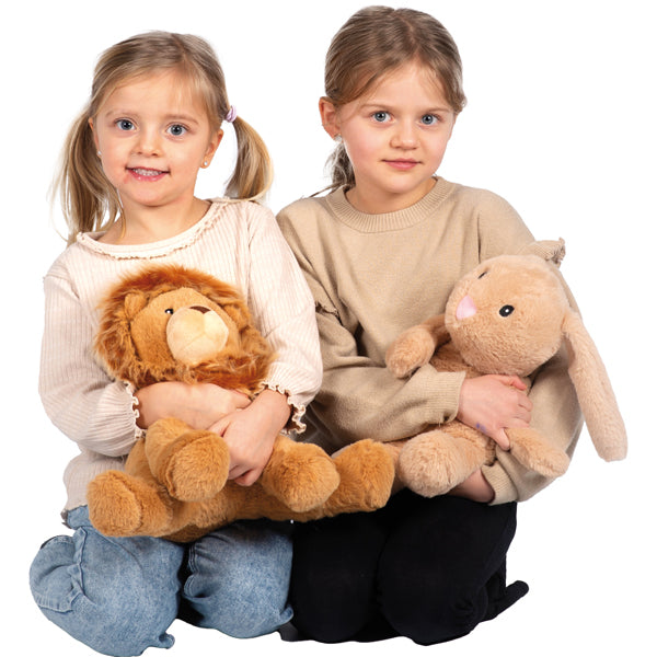 These plush toys have it all! Their cuddly tummies are filled with clay beads, which give them a pleasant weight. This heaviness gives children a feeling of security and calm when cuddling. The filling can be kneaded with the hands and the granules can be felt - this has a relaxing and calming effect. Placed on your lap, the soft toys stimulate the senses and promote concentration. So the rabbit, lion and turtle even help with learning. The head, arms and legs are filled with soft material and the eyes are embroidered. Cleaning: hand wash with mild soap.