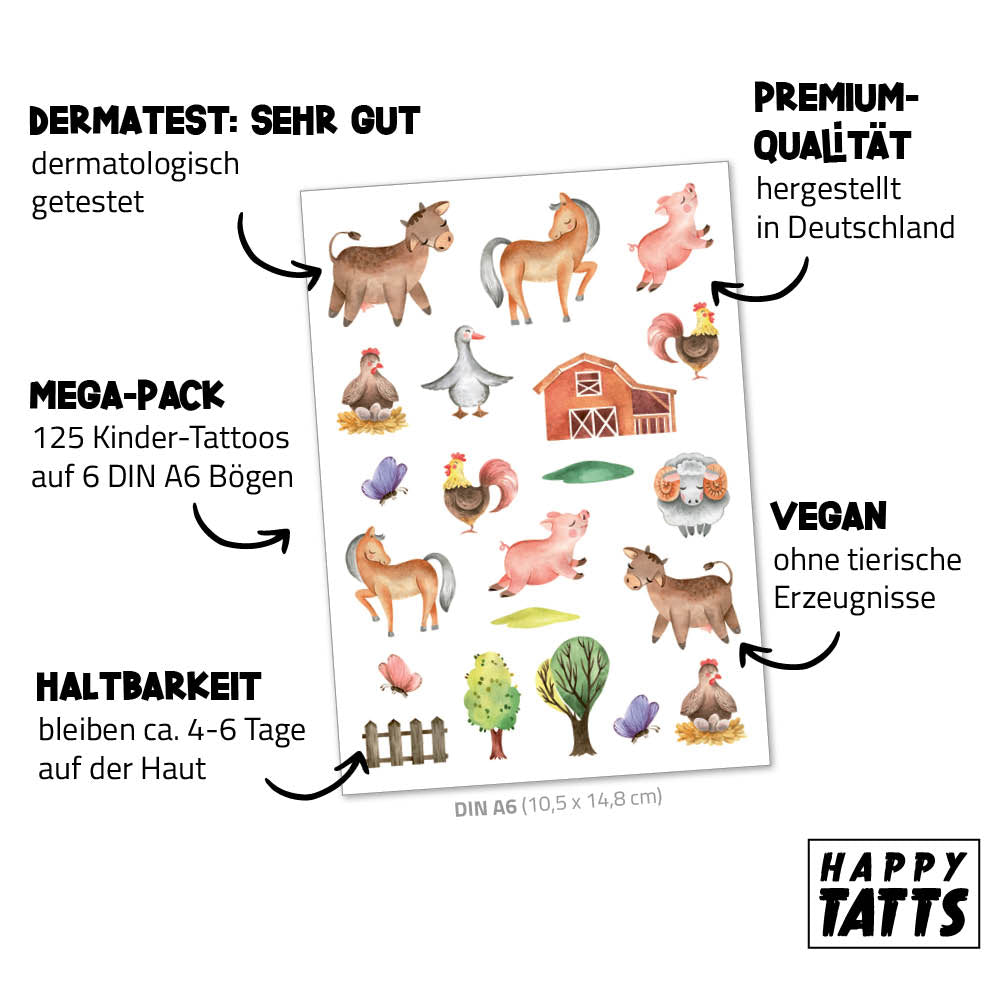 Happy Tatts Tattoos sind speziell für empfindliche Kinderhaut entwickelt, absolut hautfreundlich, dermatologisch getestet und haben eine hervorragende Haltbarkeit von 4–6 Tagen. Dank der hochwertigen Materialien lassen sie sich leicht auftragen & rückstandslos entfernen.
