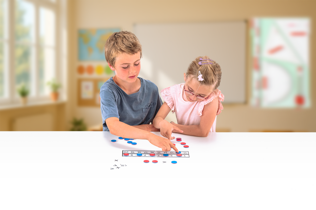 Beidseitig bedruckt, mit 22 Wendeplättchen (Ø 2,5 cm) aus RE-Plastic und 10 Rechenzeichen. Vorderseite bedruckt mit Zahlen 1-20, Rückseite leere Kreise zum Selbstausfüllen.