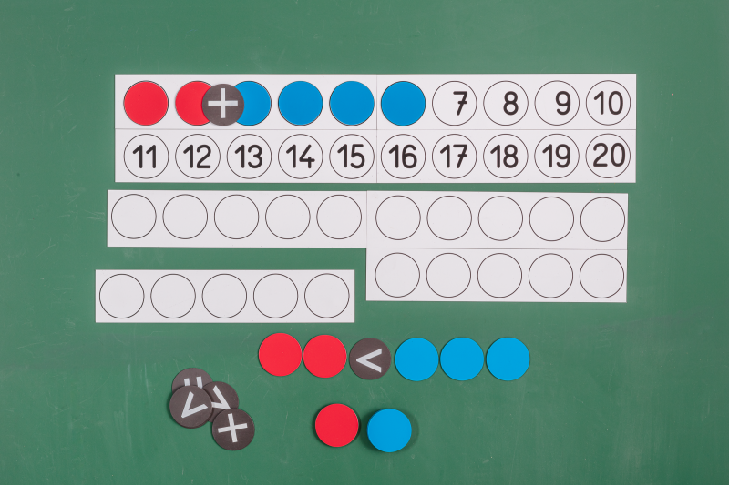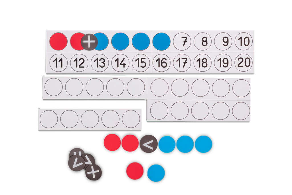 8 magnetische Leisten (gesamt 60 x 25 cm), bedruckt mit Zahlen (1 bis 20) und Kreisen (Ø 5 cm), sowie 22 magnetischen Wendeplättchen und 10 Rechenzeichen (Ø 5 cm).