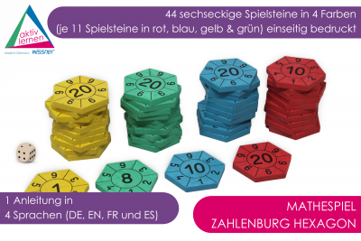 44 sechseckige Spielsteine in 4 Farben (je 11 Spielsteine in rot, blau, gelb und grün) einseitig bedruckt