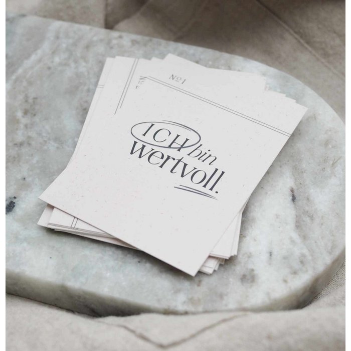 Unser Selbstwertgefühl und das Wohlbefinden können wir nur mit der Kraft unserer Gedanken steigern. Das ist sogar wissenschaftlich belegbar! Dieses Karten Set haben wir für Dich entwickelt und die Karten warten nur darauf Dich stärker, gesünder und glücklicher zu machen. Noch dazu sehen sie hübsch aus und zaubern Dir ein Lächeln ins Gesicht. Klebe doch mal Deine zwei wichtigsten Kärtchen an den Spiegel, in den Du morgens schaust. Oder vielleicht legst Du die Karte, die gerade besonders wichtig für Dich ist, auf Dein Nachtschränkchen.