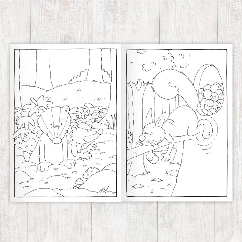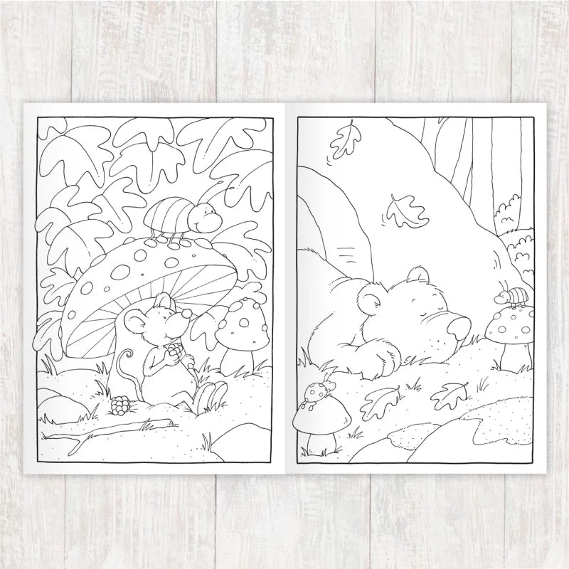 Das Malbuch DIN A4 Waldtiere von Annet Rudolph hält niedliche Motive und Szenen aus dem Leben der Waldtiere bereit, die darauf warten, von eifrigen kleinen Künstlern ausgemalt zu werden: Das Eichhörnchen zum Beispiel, das nach dem Sammeln von Eicheln erschöpft auf einen Ast sinkt. Oder die Maus, die sich im Schutz eines Fliegenpilzes saftige Beeren schmecken lässt.