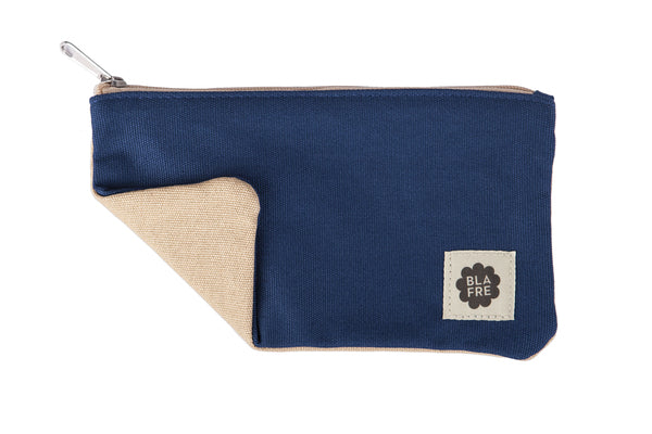 Wasserabweisendes Schüttelpennal mit Reißverschluss in Dunkelblau und Beige.