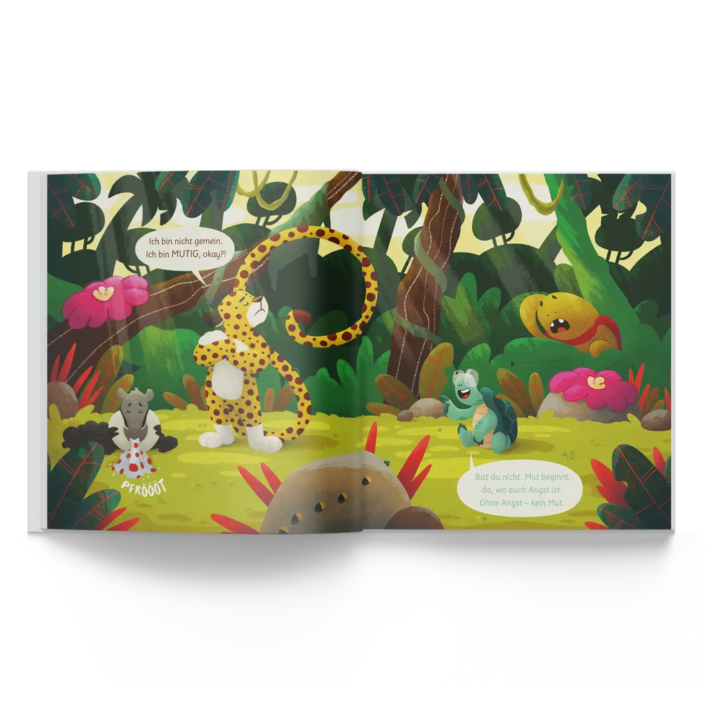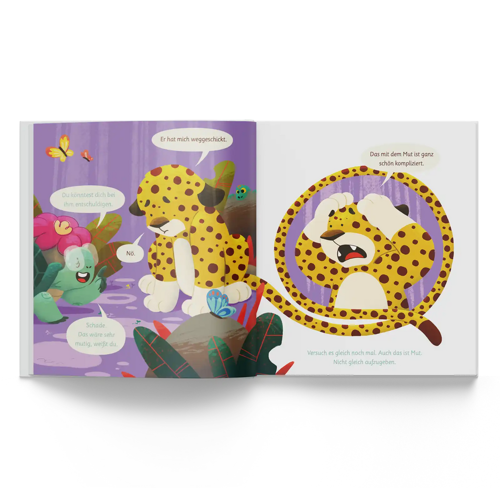 Der Leopard hält sich für das mutigste Tier im Gefühlsdschungel: furchtlos schwimmt er durch Flüsse, springt von Ästen und streift durch die Nacht. Doch was haben Angst und Rücksicht mit Mut zu tun und warum ist Mut so ein wertvolles Gefühl? Auf dem Weg, den eigenen Mut auf die Probe zu stellen, vermitteln liebenswerte Figuren den kleinen Leser*innen kindgerecht, mit einem Augenzwinkern und pädagogisch wertvoll die Bedeutung dieses Gefühls.