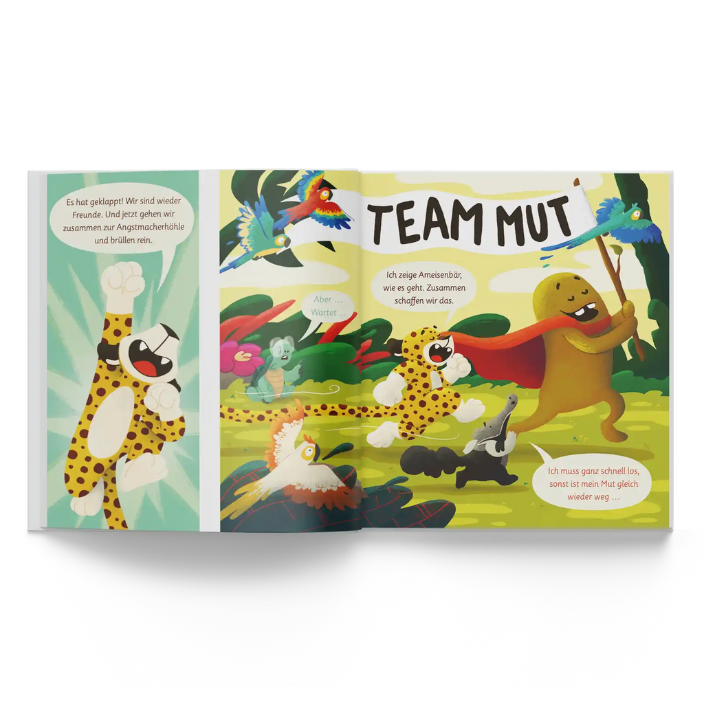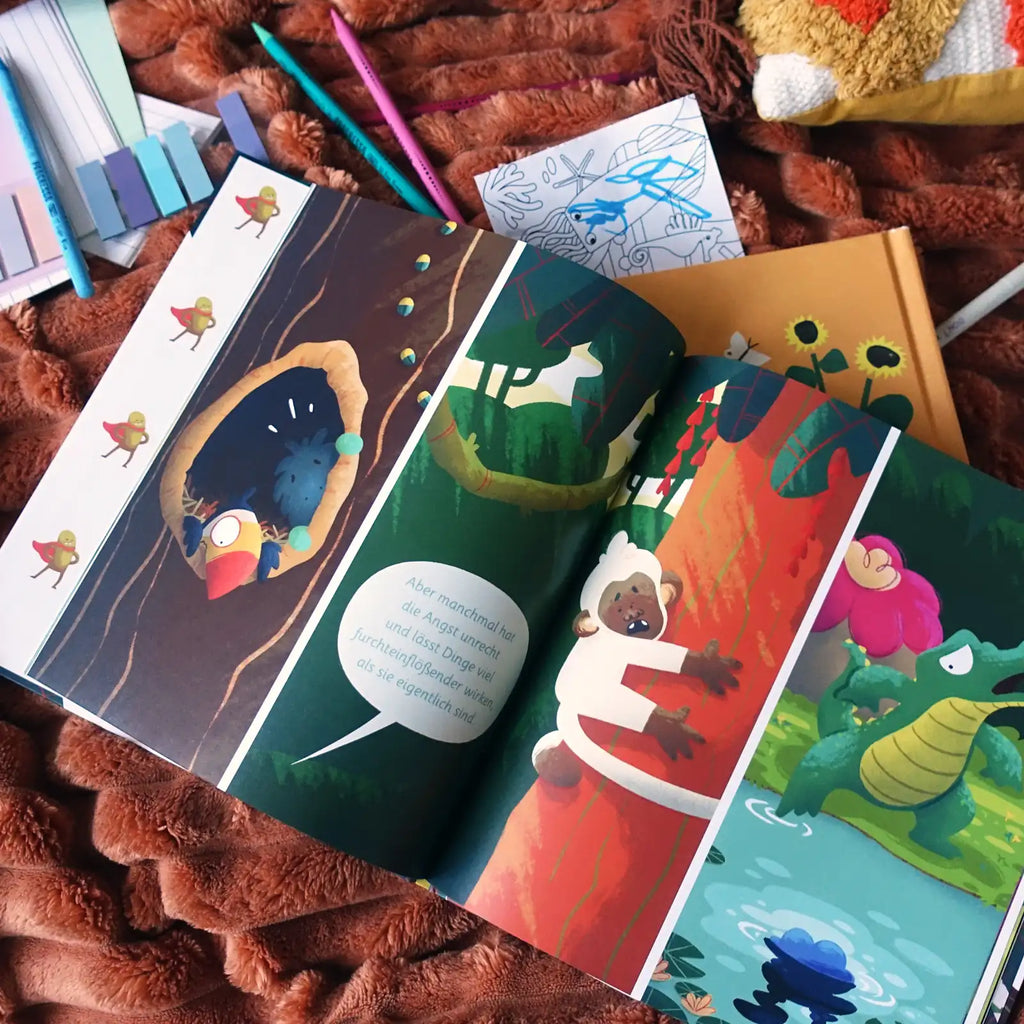 Euch erwarten 32 bunte Seiten zum Mitfiebern und Mitfühlen, doch in diesem Buch steckt mehr als eine (wirklich) schöne Geschichte. Bei dieser Dschungelexpedition wird Lesen zu Fühlen, Mitfühlen wird zu Verstehen und am Ende öffnet sich der Raum für kindgerechte Selbstreflexion. Denn der eigene Mut will unbedingt auch erforscht und achtsam begleitet werden. So wird es zu eurem persönlichen Helferlein für den Spagat zwischen Angst und Mut.