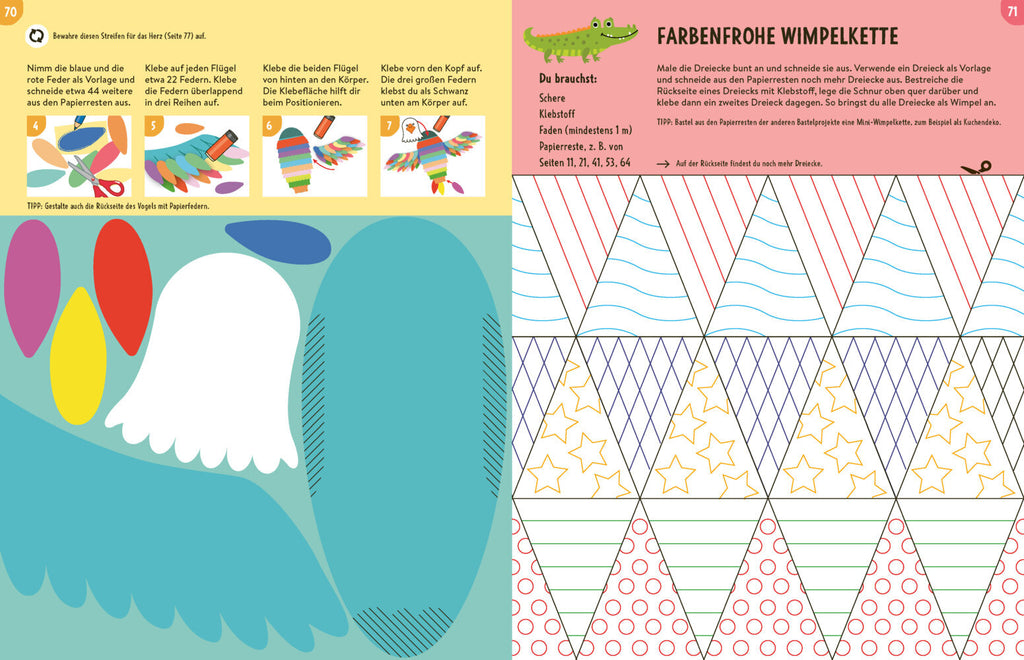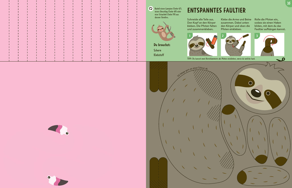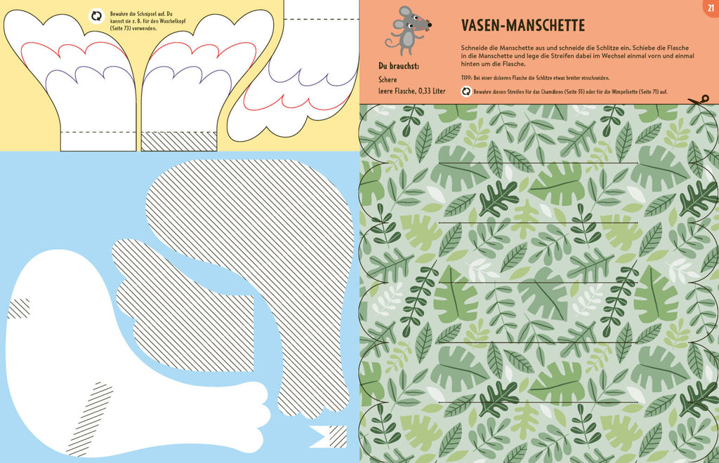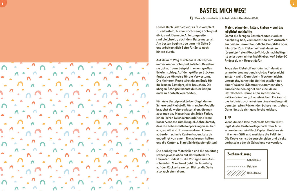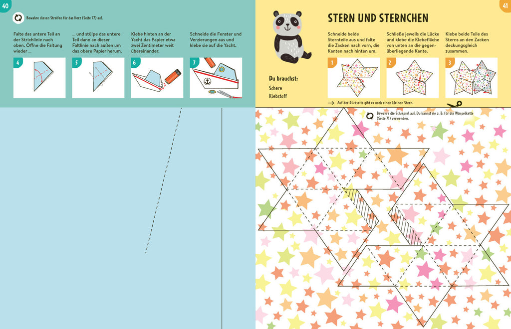 Malen, schneiden, falten, kleben und das alles möglichst nachhaltig: Damit die fertigen Bastelarbeiten rundum nachhaltig sind, enthält das Buch ein Rezept für die Herstellung von besonders umweltfreundlichem Mehlkleber.