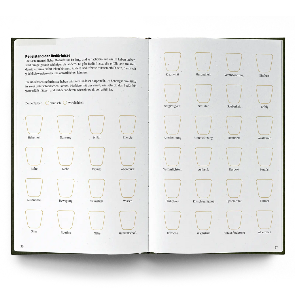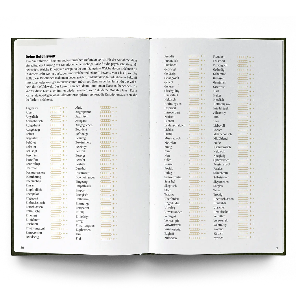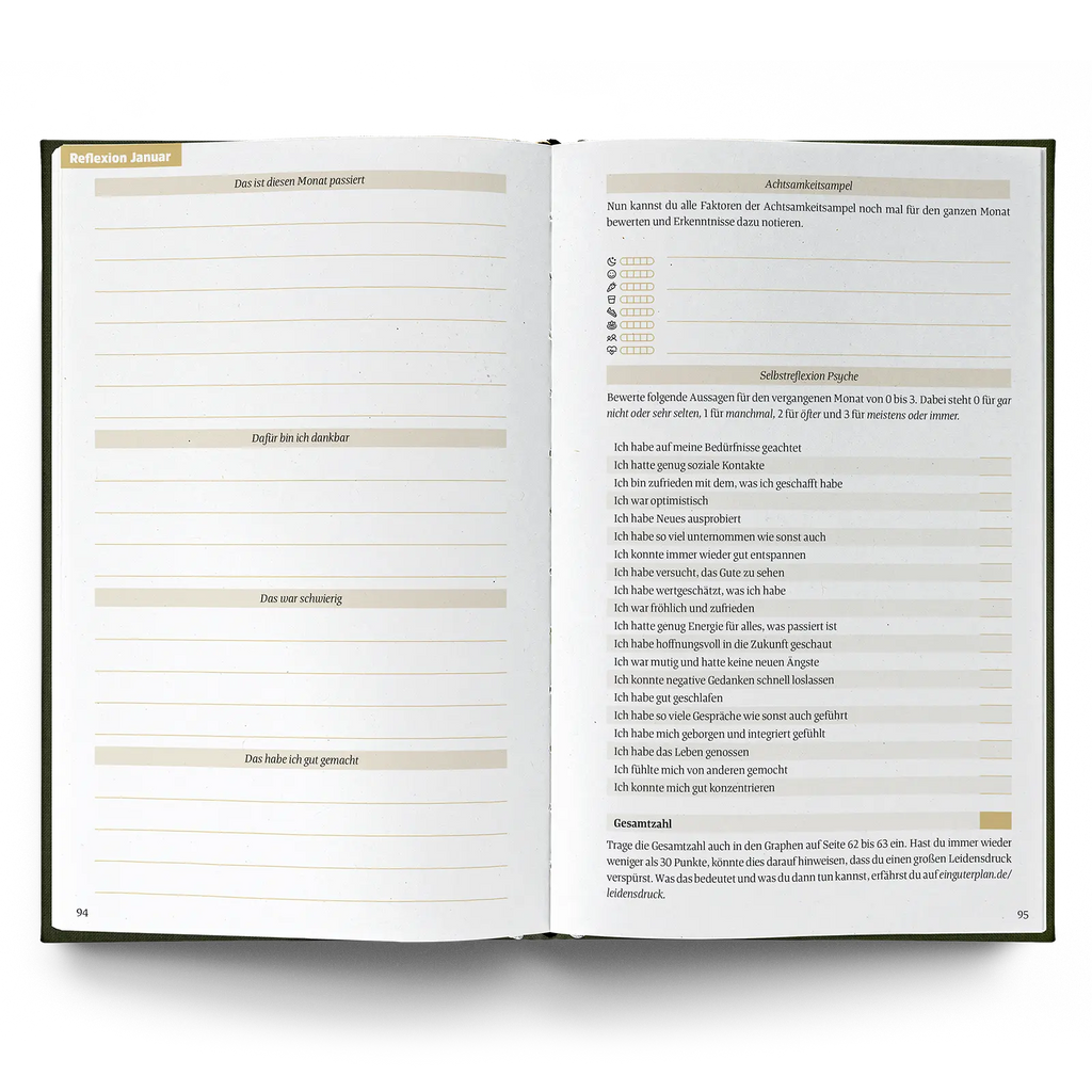 Mach zu Beginn eine große Bestandsaufnahme. 50 Seiten Lebensplaner leiten zu ehrlicher Selbstreflexion an. Was macht dich glücklich? Was sind deine Bedürfnisse? Wie gefährdet bist du für Burnout? Die Fragen gehen ans Eingemachte, aber Ein guter Plan ist auch kein seichter Wohlfühlplaner, der dir ständig rät, nur das Positive zu sehen.