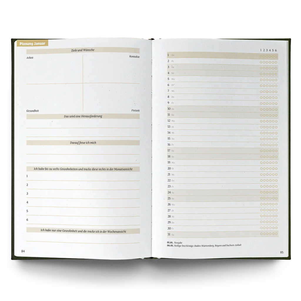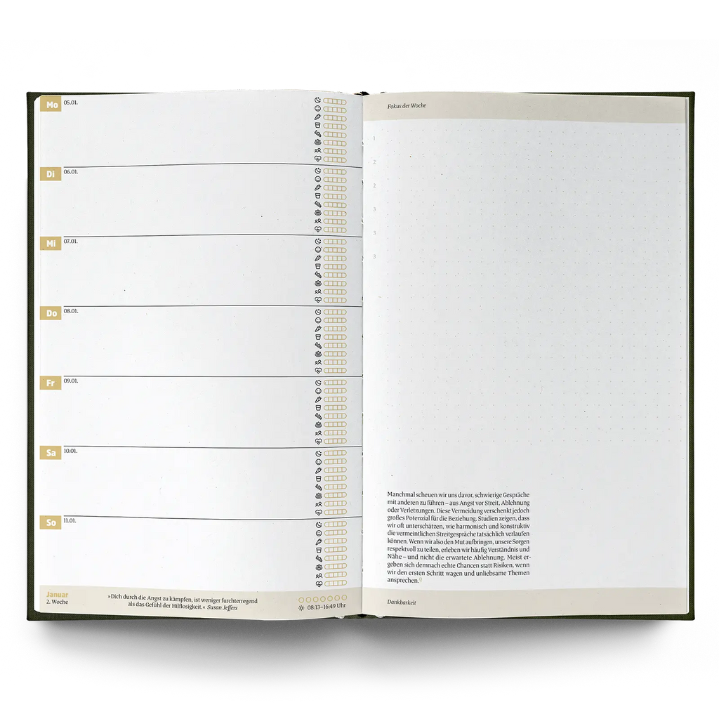 Gutes muss Gewohnheit und Reflexion zur Routine werden. Ein Terminkalender, der dich Tag für Tag begleitet, ist ideal dafür. In der Wochenansicht findest du Platz für all deine Termine und Aufgaben. Mach einen täglichen Check-In mit der Achtsamkeitsampel und lass dich von Zitaten und Tipps inspirieren.