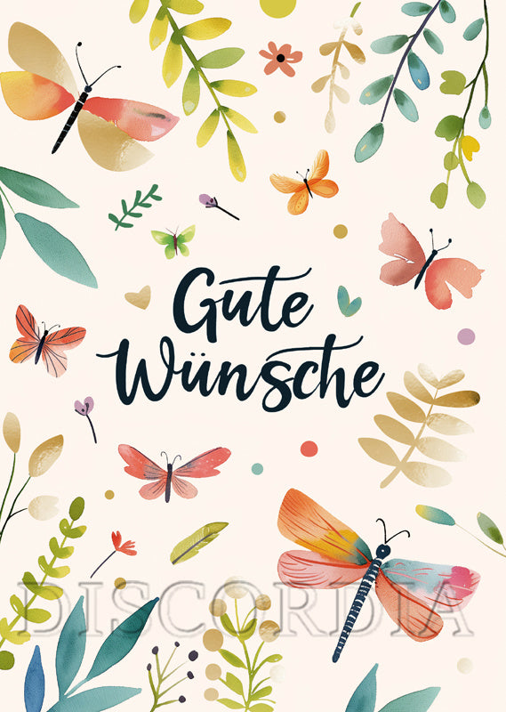Glückwunschkarte "Gute Wünsche" mit Blumen und Schmetterlingen