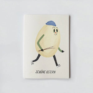 Hochwertige Klappkarte zu Ostern mit einem handgezeichnetem Ei mit Mütze und Schuhen und dem Schriftzug SCHÖNE OSTERN und einem farblich passenden Kuvert.