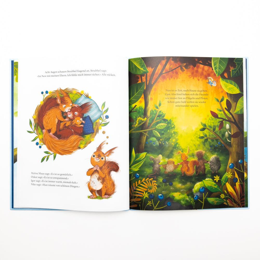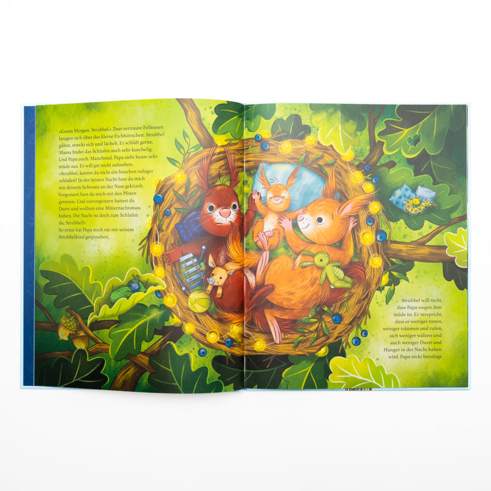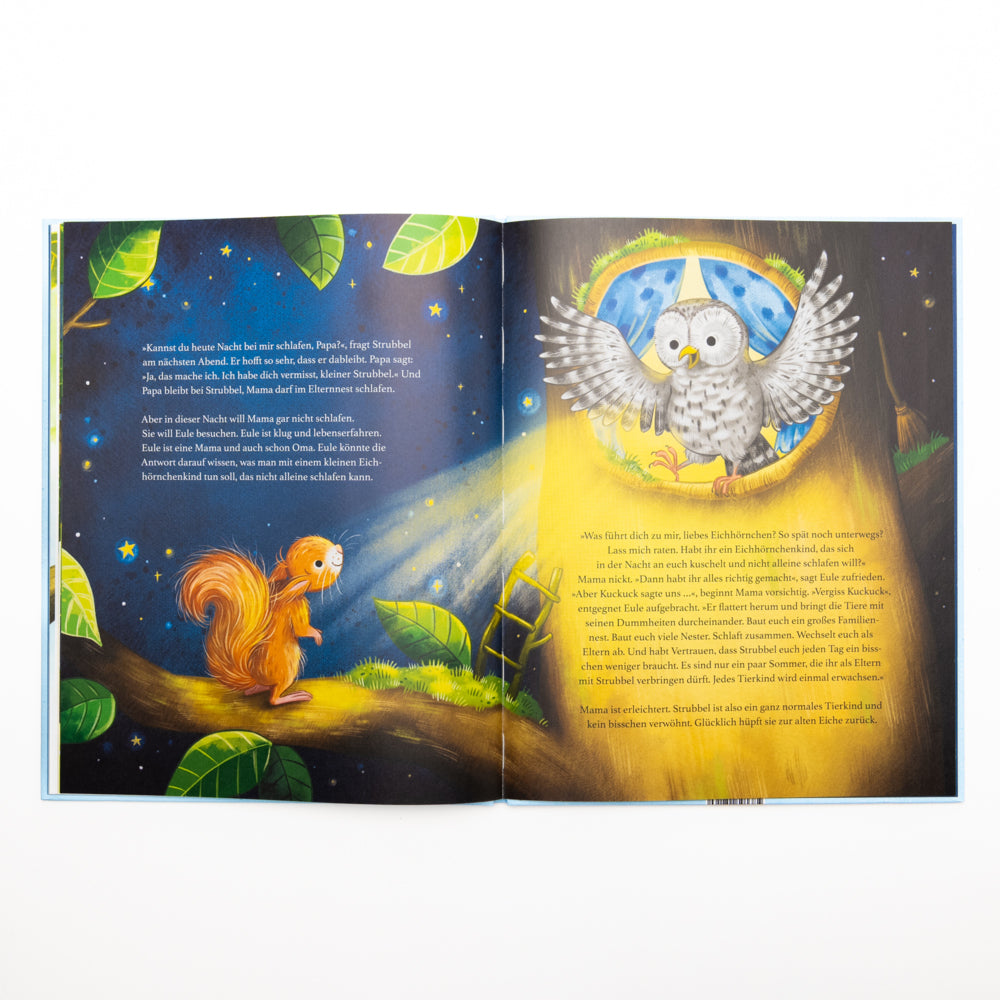 Mama und Papa sind müde. In ihrem Familiennest ist es zwar wunderbar kuschelig, doch die Nächte mit ihrem kleinen Eichhörnchenkind Strubbel sind unruhig. Und obwohl Strubbel sich große Mühe gibt, ruhig zu schlafen, will es ihm einfach nicht gelingen. Stimmt es etwa, dass er verwöhnt ist und schon längst in seinem eigenen Nest übernachten müsste, wie der Kuckuck behauptet? Schweren Herzens folgen Mama und Papa dem Hinweis des Kuckucks, aber die erhoffte Ruhe stellt sich einfach nicht ein. Bis die weise Eule ihnen verrät, worauf es beim Schlafenlernen wirklich ankommt.